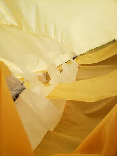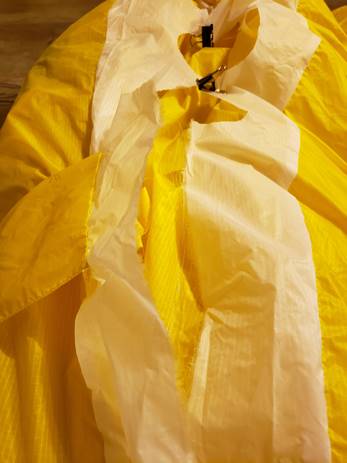 flat ripstop to patch the tear. Do this by sewing double seam all the way around the edge of the tear and then using a cross stitch seam across the