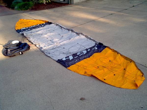 No rips, tears, repairs. Kite and bridle in new condition. Comes ready to fly with kite, lines, 4-line control handles and Flexifoil backpack.