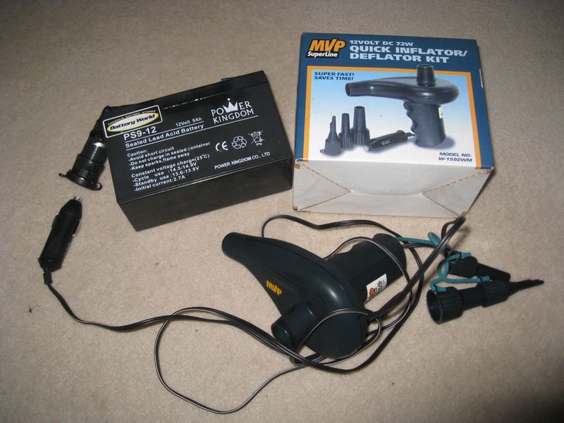 I have a 12V battery with a cigarette lighter socket and a cheap 12v inflator kit that I carry in a shopping bag. The battery is a good dead weight to