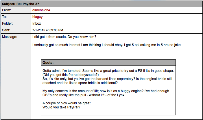 I had a 10m Psycho II and was asked about the kite by one of your potential buyers. I don't mind telling everybody what I told him now.