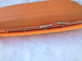 at the front sides of a simular sled. Bicycle toe clip straps were used to connect the eye loops. I attached fins under the back of the sled to help