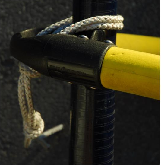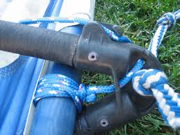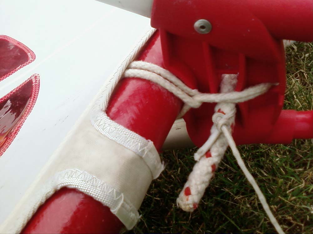 for the line to pass through or a channel and then lock that end into place - as the boom swung to perpendicular with the mast the line tightened up