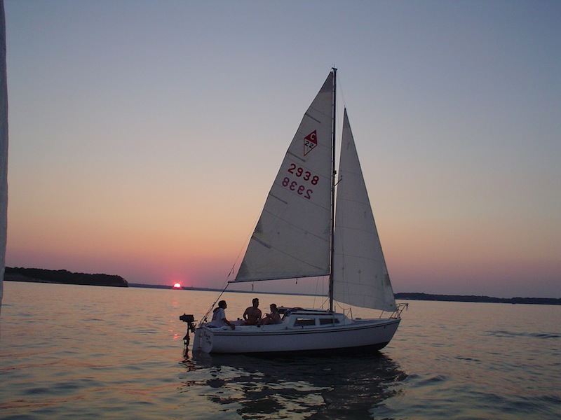 VERY nice Sunfish! I love those things. My brother in law has one and after years of sailing much more complex boats, I just love that little thing. Great fun when it's really blowing too. Here's my beloved C-22 on her first sail following her three year restoration. Please note-the long haired hippy of a skipper has since had a substantial hair cut.