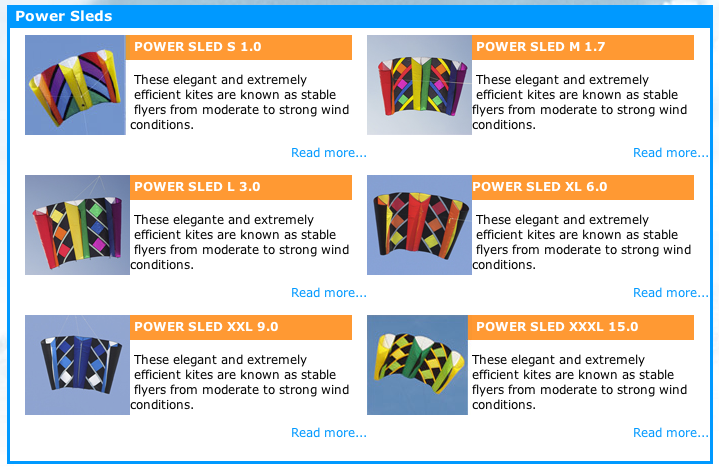 Flexifoil: 1.7m Sting, 4.9m Blade 3, 9m Blade 2.