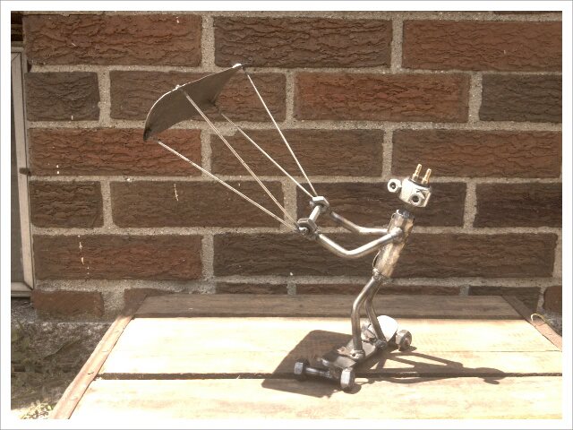 My brother is a welder and makes these really cool art pieces he calls scrap bots. I asked him if he would make me one of a dude kiting. This is what