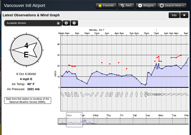 Hard to say, we went from 3m kites to 6m back to 3m. Here are the hourly reading from the two closest weather stations.