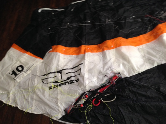 2008 Ozone Frenzy 10 meter complete. The kite was stuck in a tree and the bridles were cut to get it out. The kite, bar and lines are in perfect
