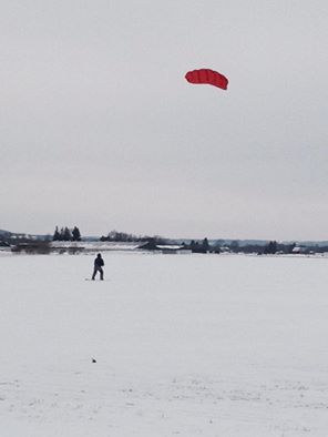 Here's a pic from yesterday, here in the Black River/Beaver River Valley. NOAA says wind was SE at 10, but I believe it might have been a bit stronger here. Nice, large, flat open space with plenty of room for wind to develop. Landowner took a pic of me riding my snowboard, flying my 4M Peter Lynn 'Skin'!