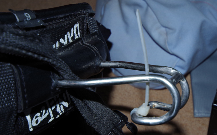 spreader bar hook. Pull the cable tie down, insert the trapeze behind it and into the spreader bar hook, then flip the cable tie back up and tuck it