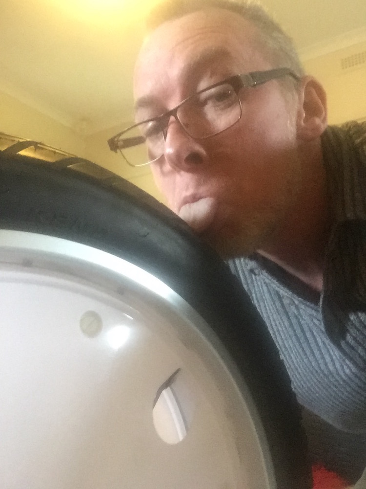 I find nothing strange with tire licking. The 2 pictures of him licking a tire are when they are brand new. He's just trying to decipher the