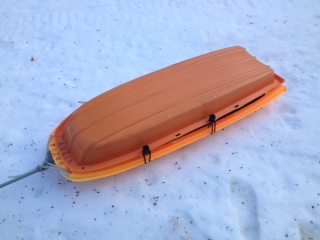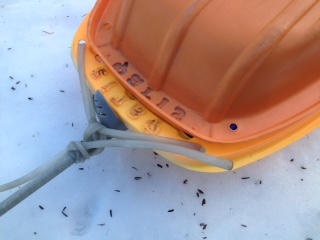 at the front sides of a simular sled. Bicycle toe clip straps were used to connect the eye loops. I attached fins under the back of the sled to help