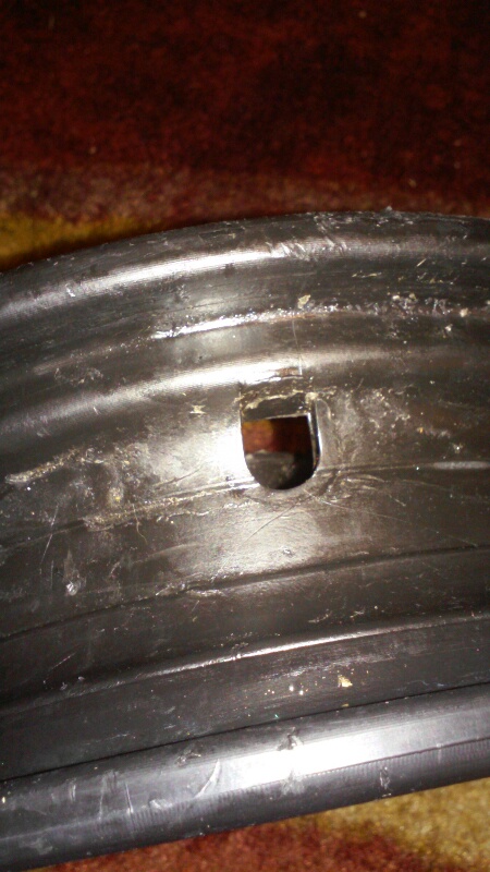 tire into shape enough that both beads should seat. Still no pressure build up. I then remembered that one of the holes for the valve stem on one