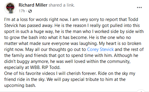 Sad news indeed. It was always great to ride with Todd. God speed my friend.